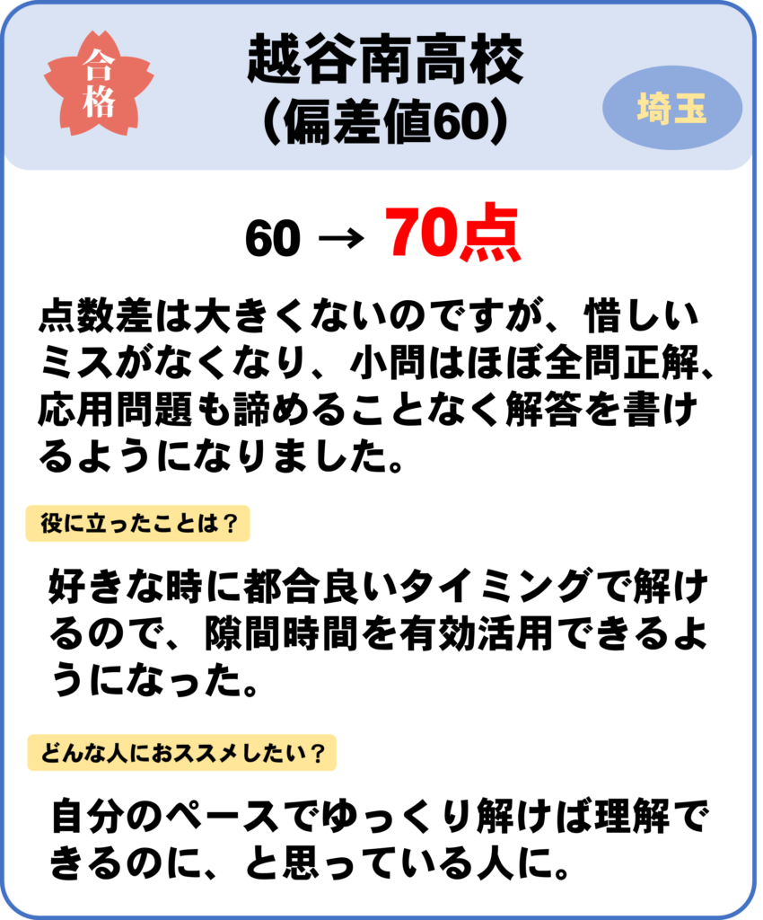 これをやっておけば大丈夫‼って思えるくらいの問題の量があり、解説動画がとてもわかりやすくて、すぐに理解できるところが役に立ちました!